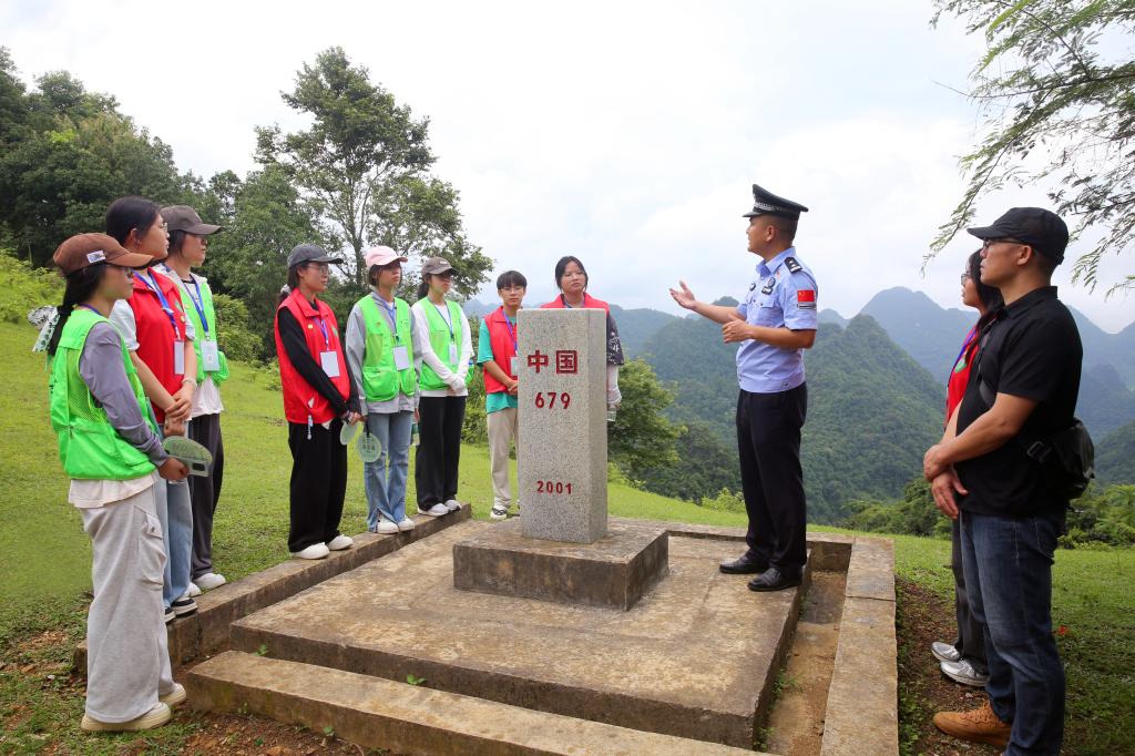 为了让大学生在戍边卫国的赤诚里触摸红色基因的温度,于边疆精神的滋养下读懂青春与使命的分量,7月14日,beat365党委宣传部带领大学生通讯社卫国戍边服务团来到靖西市吞盘乡开展暑期“三下乡”实践活动。在吞盘边境派出所民警的带领下,师生用脚步丈量祖国边境线,巡逻道上的足迹、岗亭里警惕的目光、铁丝网下的界碑,让戍边工作的艰辛与荣光立体可感。边关的风裹挟着家国情怀,引起青春与热土的共鸣。