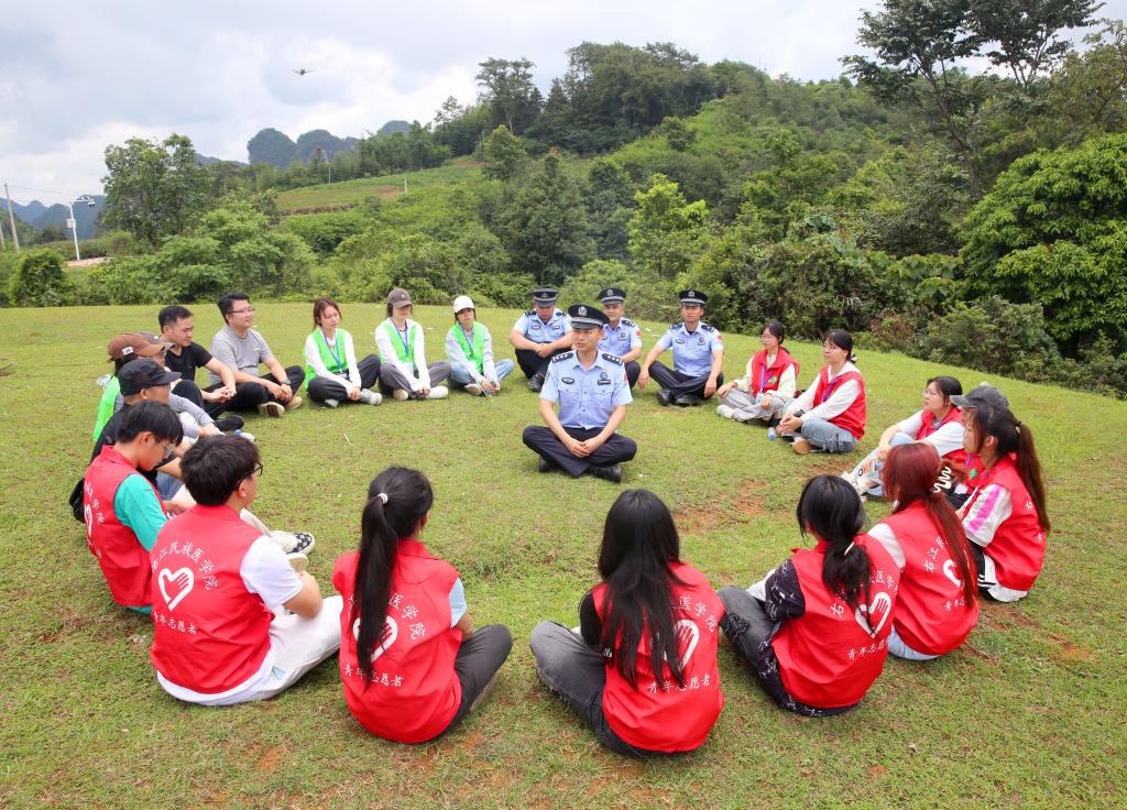 “这场青春的奔赴,是我无悔的选择!”民警与师生们围坐在界碑旁,山风猎猎,从安徽到千里之外的靖西成为驻守南疆一线的移民管理警察,张晨坚定地说道,“我毕业后换过好几份工作,直到四年前攥住国考准考证,才明白自己要的是什么。安徽到靖西的距离,在地图上是条直线,在我心里却是坐标——左边系着家的方向,右边刻着国的疆界。”他转头看向身边的年轻面孔,目光恳切:“边防警察就该像界碑,把孤独嚼碎了咽下,把艰苦踩成脚下的路。‘到祖国最需要的地方去’从不是空喊口号。你们作为医学生,将来无论是守着城市的无影灯,还是边境卫生院的药箱,只要胸腔里跳着家国,哪里都是实现自我价值的天地。”