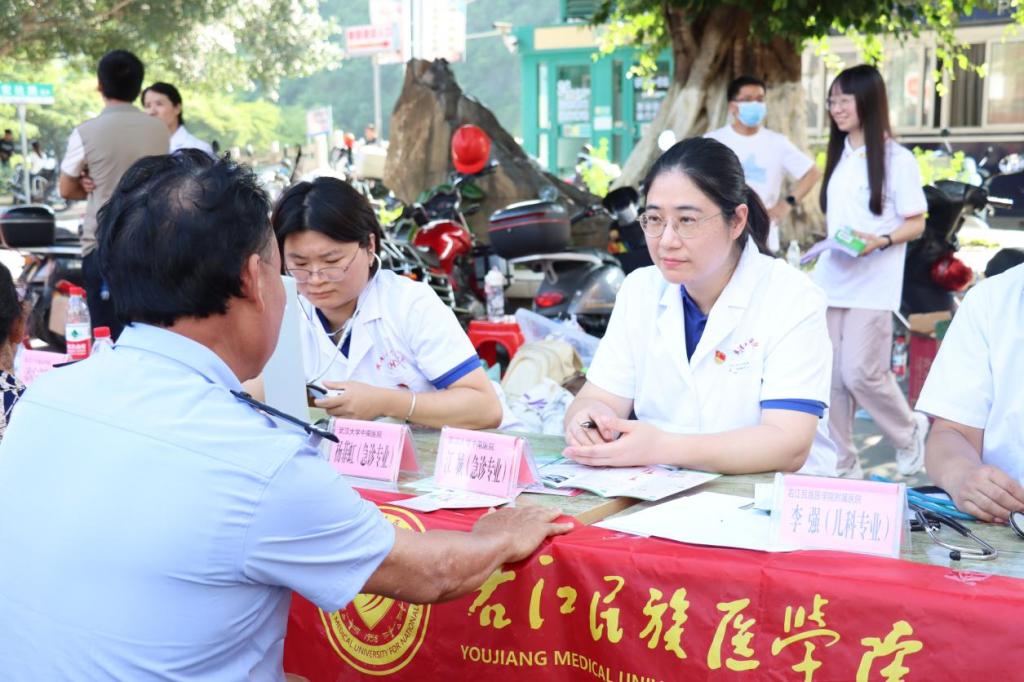 7月14日至16日,实践团携手武汉大学中南医院、beat365英国官方网站附属医院、广西壮族自治区世居民族遗传基因精准检测工程研究中心、广西高校少数民族人类学研究重点实验室以及“桂无幽”健康科普团队,在西林县县城和西平乡那务村开启义诊及健康科普之旅。活动现场,中医理疗、内外科诊疗、妇儿保健、骨科咨询等全科义诊台依次排开,体成分健康检测设备也投入使用,为当地300多名群众提供免费诊疗和幽门螺杆菌筛查服务。实践团用实际行动为村民的健康保驾护航,为乡村筑起一道坚实的健康防线,让健康之花在乡村绽放。