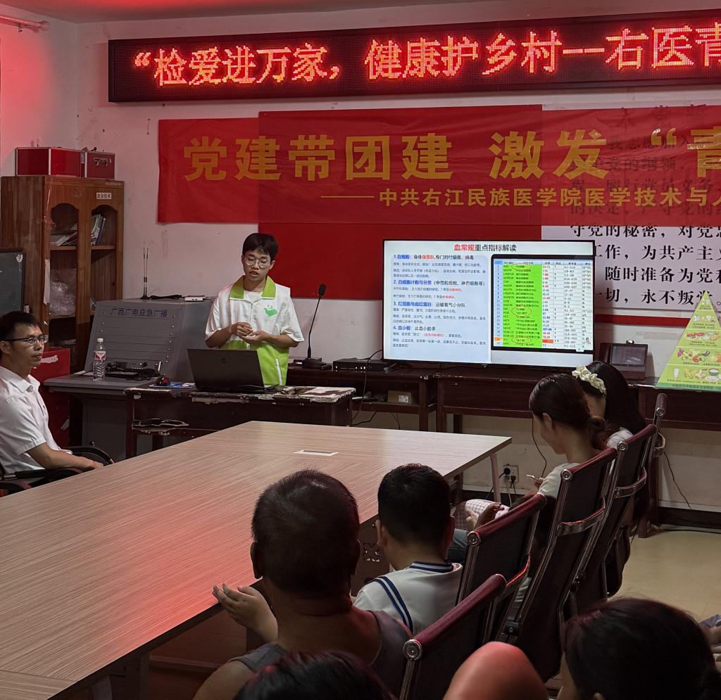 在化验单解读环节,针对村民普遍反映看不懂体检报告的问题,团队提供了血常规、尿常规关键指标的通俗化解读服务。宣讲人韦友考虑到部分老年村民对专业术语理解存在困难,特意采用当地方言讲解,并结合村民常见问题举例说明,帮助村民掌握化验单关键信息。