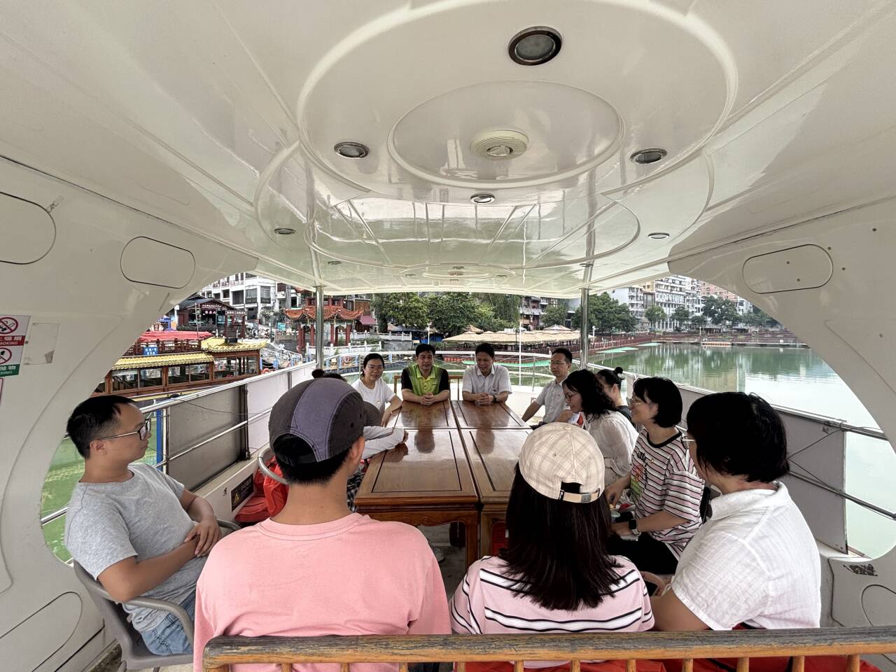 活动首站为“美丽右江游”。右江作为珠江流域西江水系的重要支流,流经广西百色市境内时,不仅造就了两岸秀美的自然风光,更孕育了深厚的历史文化底蕴。党员教师乘船游览右江时,一边沉浸式欣赏江水清澈、岸树葱郁、村落错落的景致,任微风拂过江面泛起粼粼波光;一边聆听讲解员介绍右江流域的风土人情及传统民俗,让教师们直观了解了百色的历史渊源,深刻感受其地域文化魅力,进一步加深了对这片土地的热爱。