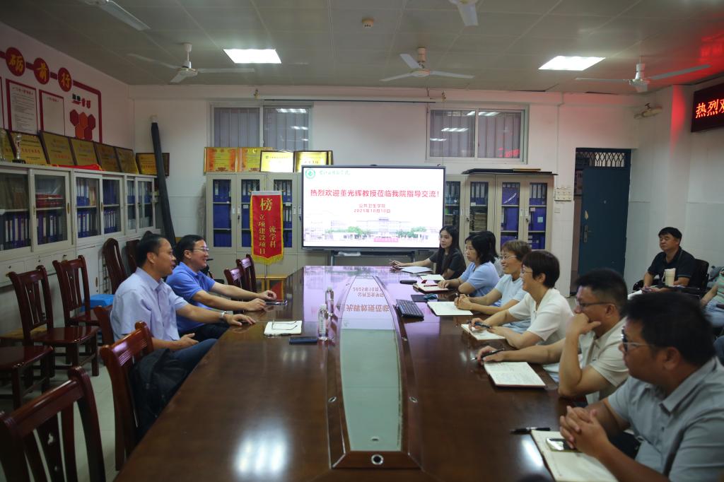 在交流中,公共卫生学院院长郭蕊介绍了学院的“党建+”系列内容。董光辉教授在听取介绍后指出,公共卫生学院应紧密对接区域需求,在地方病防治、环境与健康等公共卫生领域形成研究特色,并以科研反哺教学;作为学校推动新时代区域性高水平医科大学建设高质量发展的重要组成部分,公共卫生学院要持续深化教学改革、强化学科内涵,力争在学科建设与人才培养上实现新跨越。