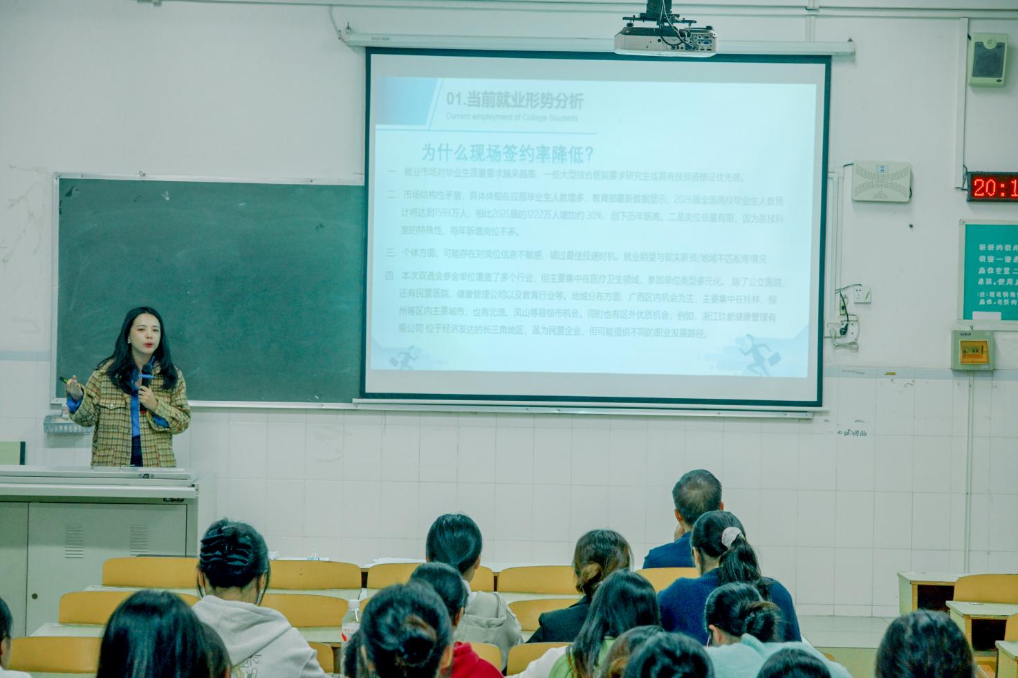 为扎实推进2026届毕业生就业工作,引导学生树立正确就业观、择业观,促进毕业生高质量充分就业,11月5日晚,医学影像学院在百城校区5栋301及506教室分专业召2026届毕业生就业动员大会。大会设医学影像学、医学影像技术两个专场,全体毕业生参会。