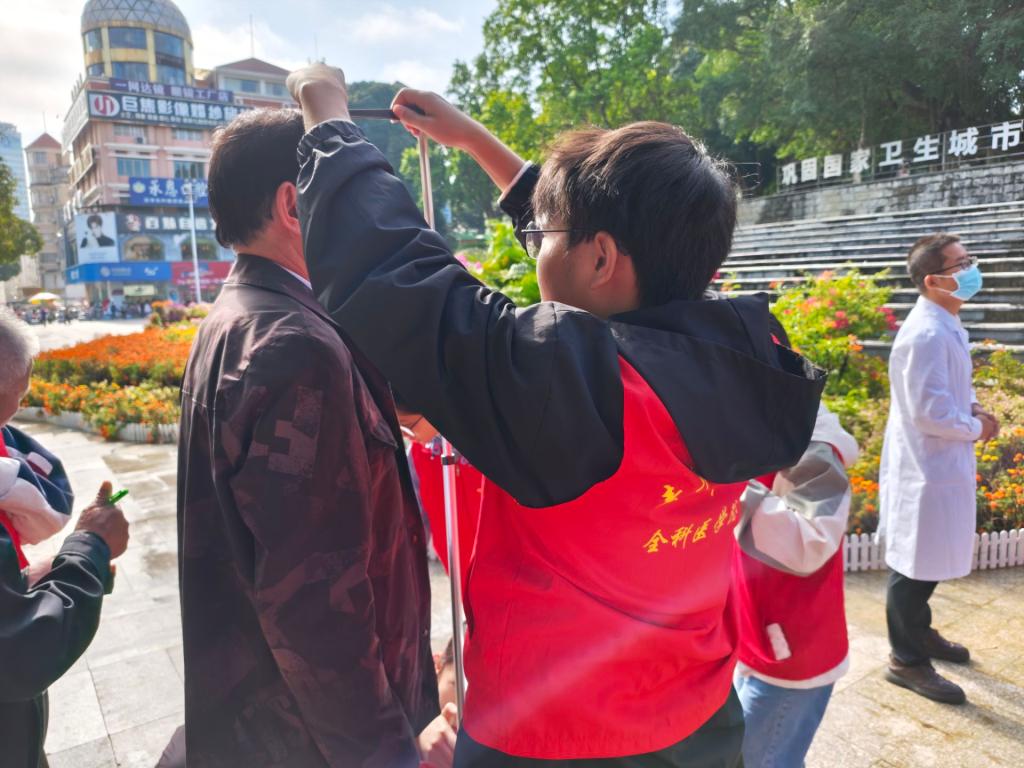 志愿者帮助居民测量身高