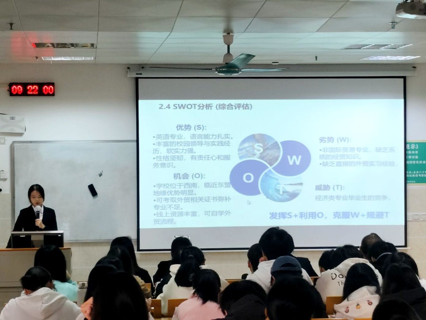 谭会恒对比赛进行总结点评。她充分肯定了参赛学生的积极准备与创新思维,同时针对规划中存在的不足提出了三点具体建议:一是要强化职业探索的深度,深入了解目标职业的真实需求;二是要注重数据的有效运用,鼓励结合行业报告、就业数据等建立更具说服力的分析模型;三是要突出个人核心竞争力的塑造,特别是在“语言+”复合型能力构建方面,应制定更具体、可衡量的提升计划。她强调,职业规划是一个动态调整的过程,希望同学们持续完善、勇于实践。本次比赛作为学院实践育人的重要载体,不仅为学生提供了锻炼表达能力与逻辑思维的平台,更有助于拓宽职业视野、明确发展方向。