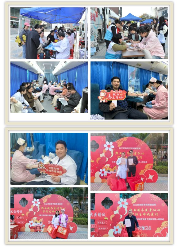 2026年1月29日至30日,临床医学院(附属医院)举办“热血暖冬 医者仁心 护佑生命 我先行”主题无偿献血活动,在总院区外科大楼前广场与百东院区捐血屋同步开展,医护人员纷纷排队献血,以实际行动践行医者使命,彰显甘于奉献、大爱无疆的崇高精神。