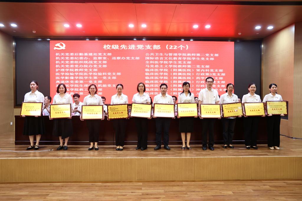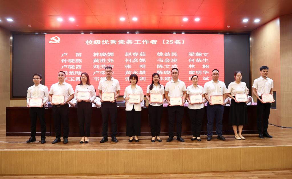 校党委副书记、校长李雪斌宣读了关于表彰先进二级党组织、先进党支部、优秀共产党员、优秀党务工作者和优秀党支部书记的决定。22个先进二级党组织、先进党支部,100名优秀共产党员、25名优秀党务工作者、20名优秀党支部书记受到表彰。与会校领导为获奖集体和个人颁发了证书和奖牌,邓砚书记、李雪斌校长向李玉贤、梁爱秋两位老党员颁发“光荣在党50年”纪念章,并向她们表示祝贺,会场响起阵阵热烈的掌声。