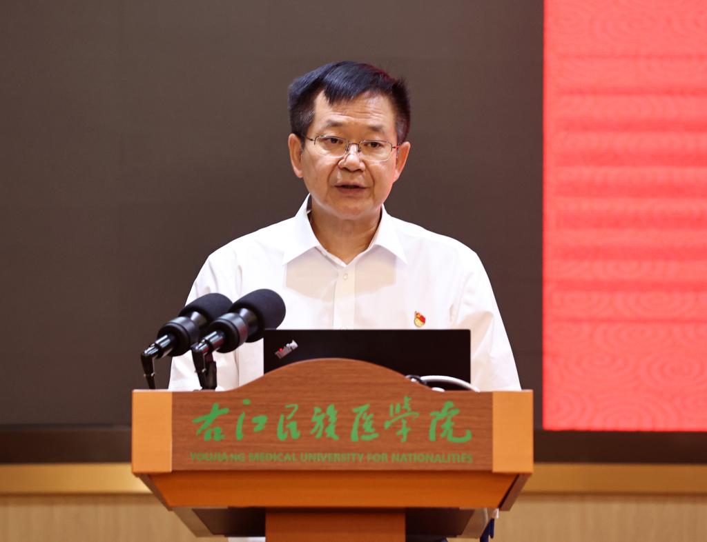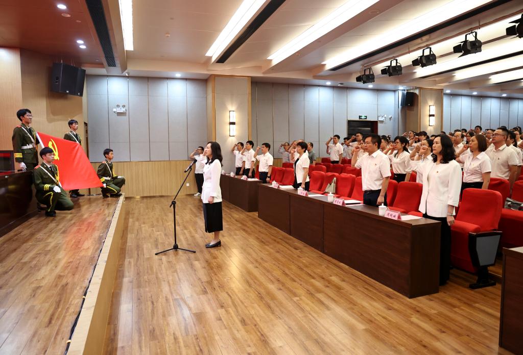 在大会上,校党委书记邓砚带领与会新党员、老党员高举右拳,面向党旗,庄严宣誓,重温入党誓词。一句句铿锵有力的誓言表达了共产党员不忘初心、牢记使命,为中国共产党奋斗终生的夙愿,宣示学校新一届领导班子坚定政治信念,坚持党的领导,奋力推进学校“更大申博”,建设新时代区域性高水平医科大学的信心与决心。
