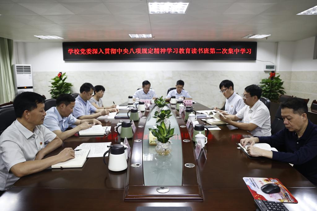 4月24日下午,学校在第一会议室举办深入贯彻中央八项规定精神学习教育读书班第二次集中学习暨党委理论学习中心组2025年第三次集体学习研讨会。学校党委常委李雪斌、黄龙坚、赵丽娟、冼季夏、解继胜、谭盛葵、王俊利、赵骏耀、韦鹏涯参加会议。会议由学校党委书记李雪斌主持。