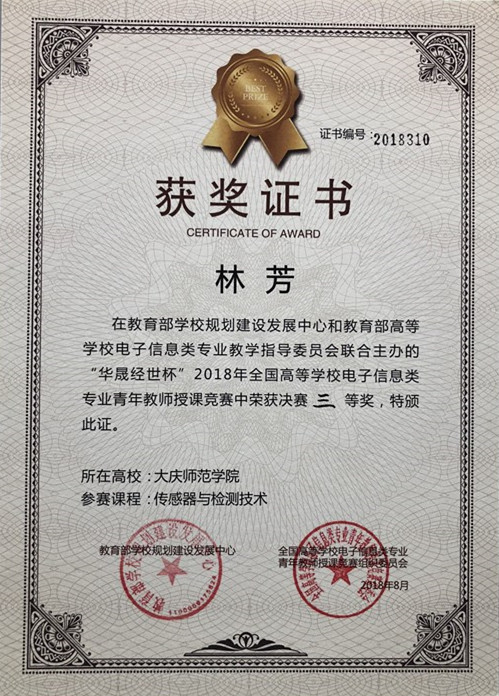2018年8月30日,由教育部学校规划建设发展中心、教育部高等学校电子信息类专业教学指导委员会联合主办的“华晟经世杯”2018年全国高等学校电子信息类专业青年教师授课竞赛,在河北工业大学举行决赛。本次竞赛从2018年1月份开始,历时8个月,全国100多所高校,包括南京邮电大学、国防科技大学和哈尔滨工程大学等电子信息类知名大学,400多名教师报名参赛。开云开云kaiyun官方网站林芳老师在获得初赛华北赛区二等奖后,在决赛中获得全国三等奖。