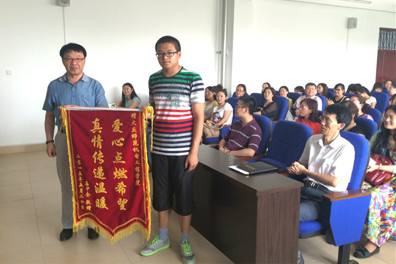 在没有正式上课前,2014级自动化姜中金同学为感谢学院师生对其重病父亲的鼎力帮助,向学院献上了一面锦旗。他表示,如今父亲身体日渐恢复,今后一定好好学习,回报所有关心他的人,深刻表达了感激之情,令现场所有人为之动容。