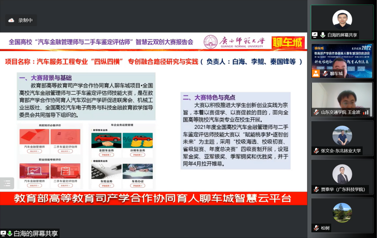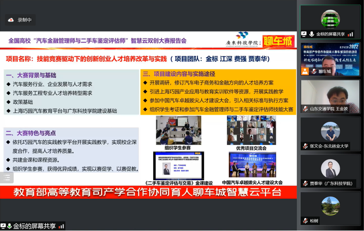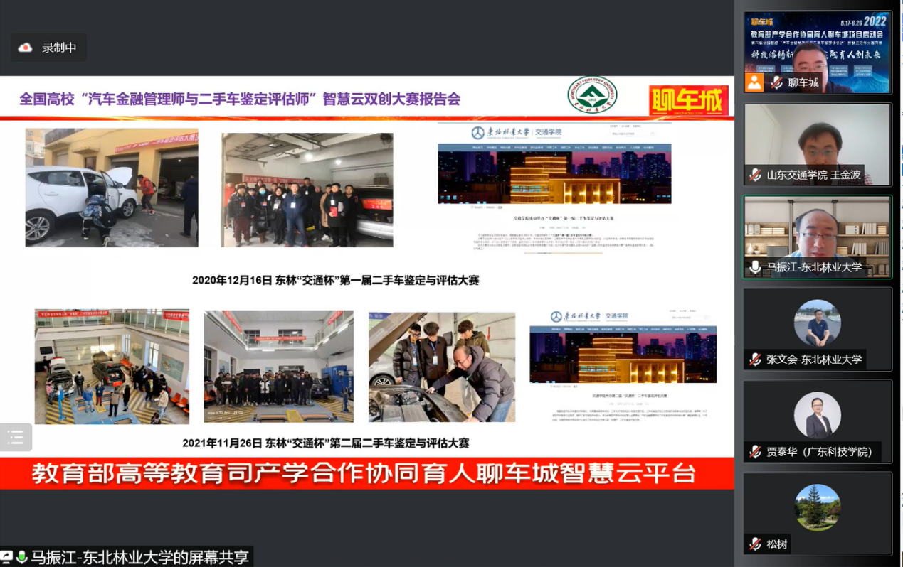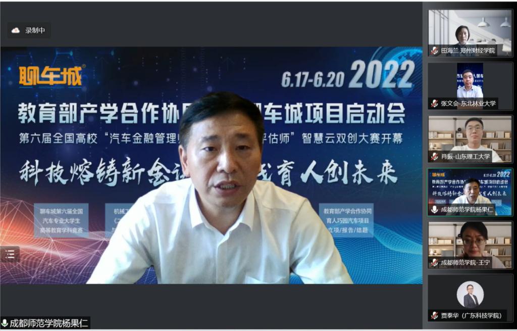 2022年6月18日,教育部产学合作协同育人聊车城项目启动会暨2022年全国高校汽车金融管理师与二手车鉴定评估师智慧云双创大赛开幕式如期举办。本届大会以“线上+线下”相结合的方式举办,线上通过腾讯会议室参会,并在重庆设立主会场。会议主题为“科技熔铸新金课·实践育人创未来”,会议共邀请来自全国各省市61名高校领导、教师及汽车产业学者、行业专家、名企高管参加。开云赵大伟老师、陈巧珍老师代表项目组成员参加了此次盛会,共话育人未来,传递时代强音。