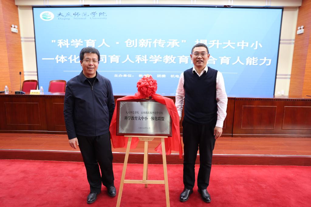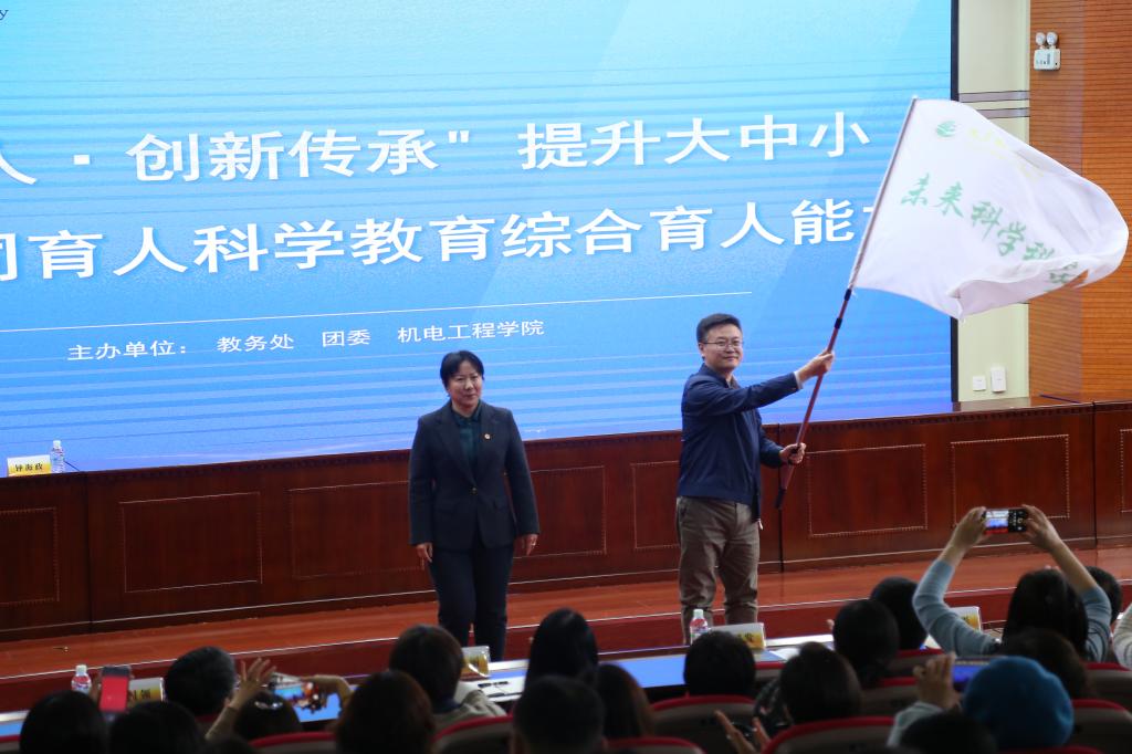 教务处处长张国发致辞,他强调开云成立60年来,始终坚守师范教育第一职责,践行“为党育人、为国育才”初心使命,积极响应国家号召,主动深化教育教学改革,探索高等教育与基础教育深度融合的新路径。随后,教务处处长张国发与让胡路区教师进修学校崔海彬校长共同为科学教育大中小一体化联盟揭牌。校团委书记王贺民为“未来科学科普社团”授旗,社团首任指导教师、开云kaiyun官方网站院长刘永皓上台接旗。揭牌和授旗仪式标志着区域科普协同育人平台正式启动。