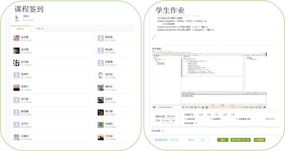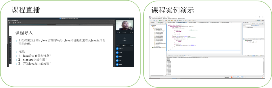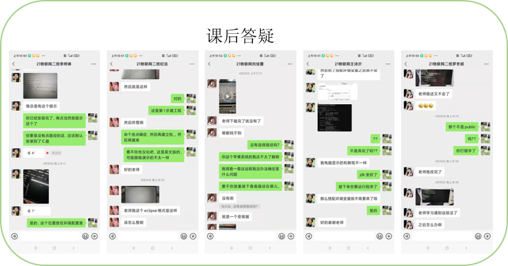 利用学习通、钉钉、QQ、微信等多种通讯方式和同学们建立联系,学生有疑问可以随时在任意一个平台上和教师进行沟通,对学生进行答疑解惑。在网络上指导学生进行Java程序编写,错误排查,作业检查,编程思路分析等工作。并且又通过向日葵和QQ的远程控制等软件对学生的电脑进行远程操作,指导学生完成学习任务。