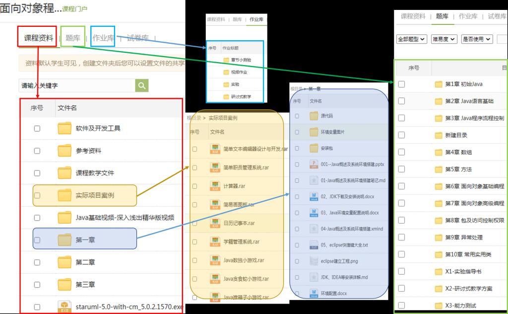 课程线上教学资源丰富,不仅提供软件开发工具、教学文件,还同步课堂内容,提供课程源代码;针对案例教学,提供实际项目案例;课程个题库、作业库建设完备。