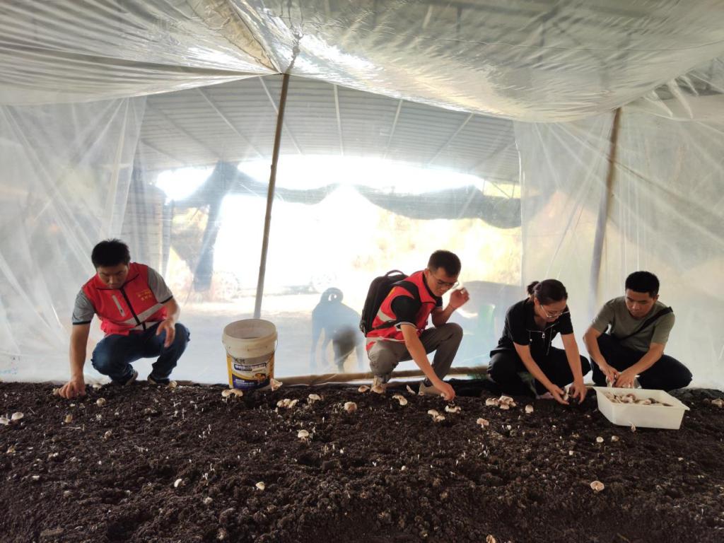 王荣贵组织村两委、驻村工作队观摩学习草菇种植技术