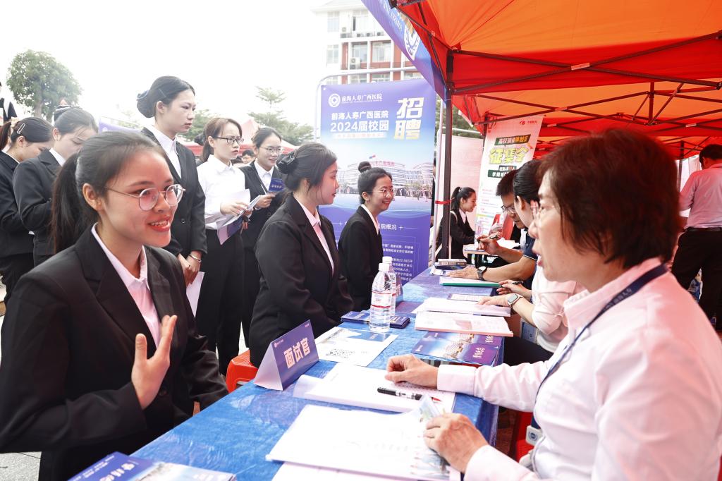 2021级高护班利远英感谢学校为他们提供就业的平台,她希望能回到家乡工作:很感谢学校给了我们这个面对面招聘的平台,我是钦州本地人,之前在钦州市人民医院实习,带教老师对我们都很好,很喜欢那里的氛围,所以希望能够进入钦州市人民医院工作。