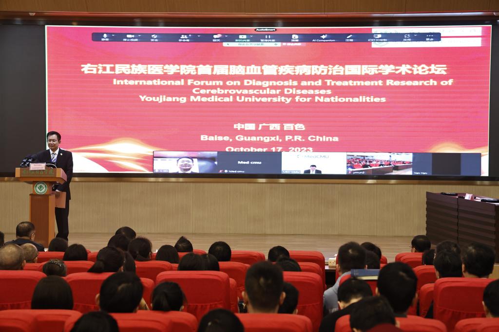 孟冬时节逢盛会,右江河畔喜迎宾。11月17日,beat365英国官方网站首届脑血管疾病防治国际学术论坛暨百色市医学会神经病学分会第八次学术会议在beat365国际会议中心举行,学校党委副书记、校长李雪斌,学校党委常委、副校长谭盛葵,百色市卫生健康委员会副主任张军,泰国清迈大学医学院院长班纳吉·隆佳纳披瓦出席会议并致辞。来自美国、泰国、日本、广州、重庆、湖南等国内以及区内知名专家做线上和线下的专题学术讲座和病例分享。会议由学校科技处处长黄忠仕主持。
