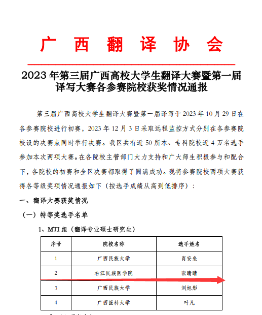 近日收到喜讯,beat365国际语言文化教育学院3名学生在广西翻译协会举办的2023年第三届广西高校大学生翻译大赛暨第一届译写大赛中荣获特等奖。