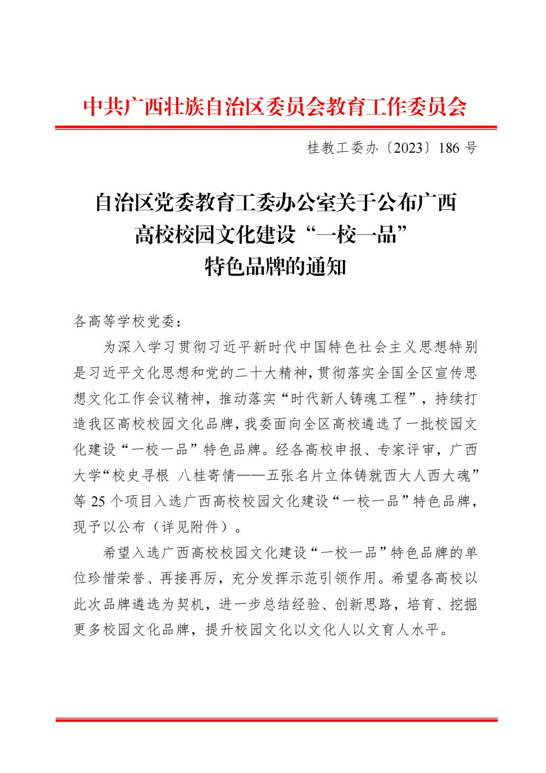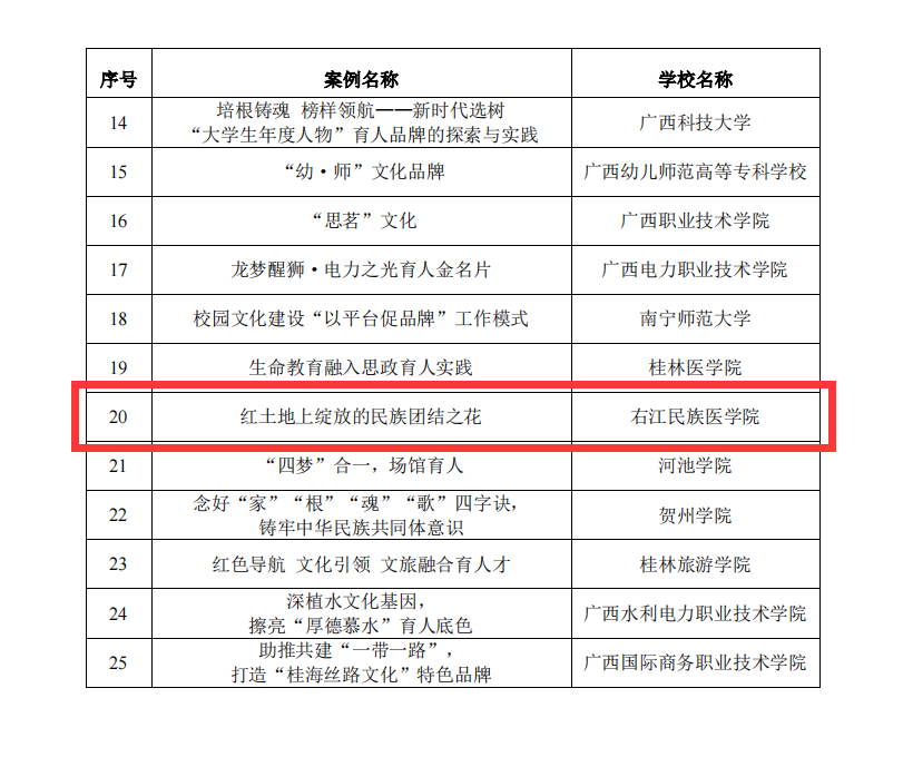 近日,自治区党委教育工委公布广西高校校园文化建设“‘一校一品’”特色品牌。beat365推荐报送的《红土地上绽放的民族团结之花》校园文化品牌入选广西高校校园文化建设“一校一品”特色品牌。