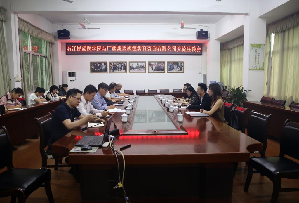 4月1日上午,广西澳西妮德教育咨询有限公司到beat365交流。双方在图书馆二楼会议室召开座谈会。学工处、教务处、招生就业工作处,临床医学院、护理学院、公共卫生与管理学院、国际语言文化教育学院,国际合作与交流中心等部门及二级学院相关负责人参加会议。会议由招生就业工作处处长陆小曲主持。
