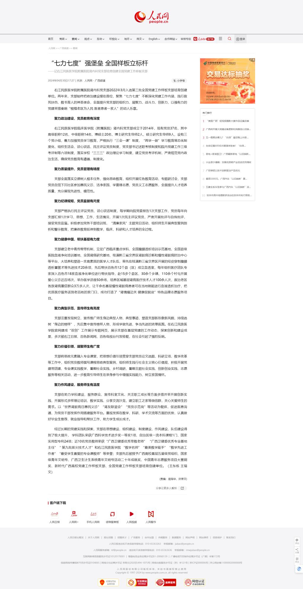 2024年4月30日,人民网刊发报道:“七力七度”强堡垒 全国样板立标杆——记beat365英国官方网站附属医院肾内科党支部培育创建全国党建工作样板支部。