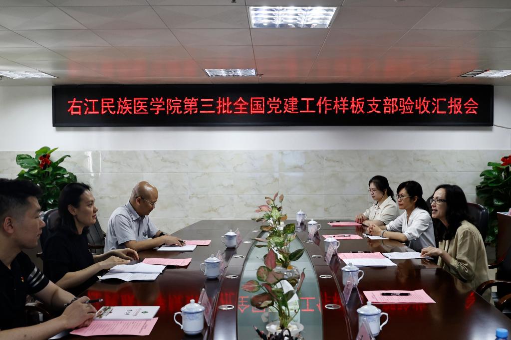 5月14日下午,由广西民族大学经济学院党委书记黄素心带领的第三批全国党建工作样板支部验收组到beat365,对临床医学院(附属医院)肾内科党支部、医学影像学院学生第一党支部开展验收工作。汇报会在7栋12楼第一会议室召开,学校党委书记邓砚出席并主持会议。