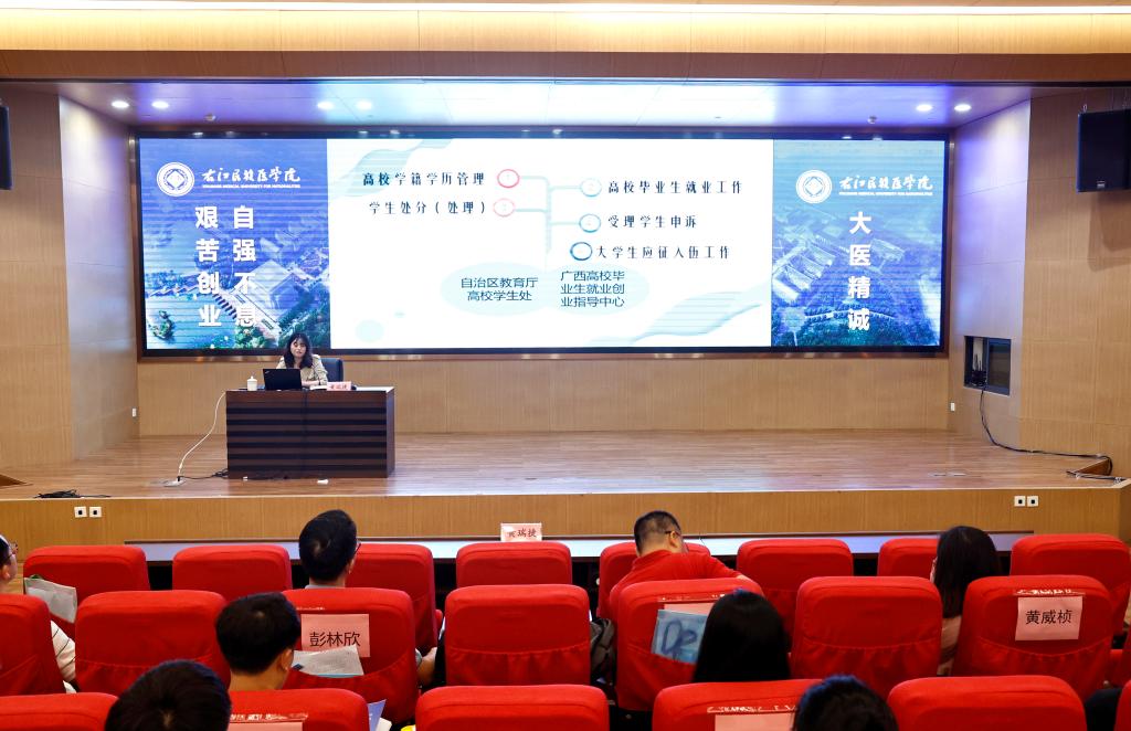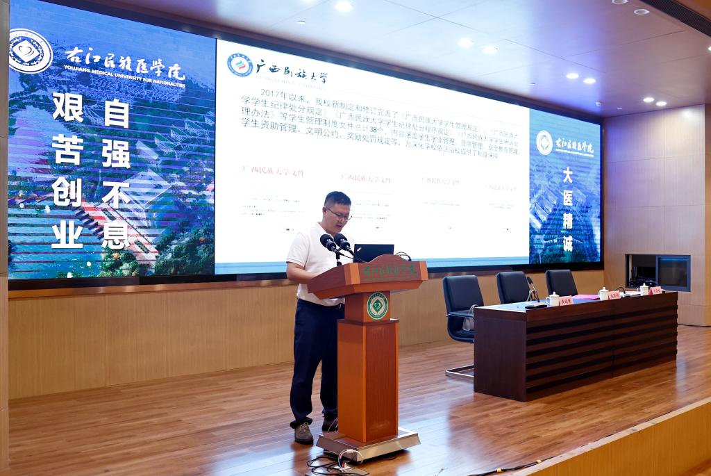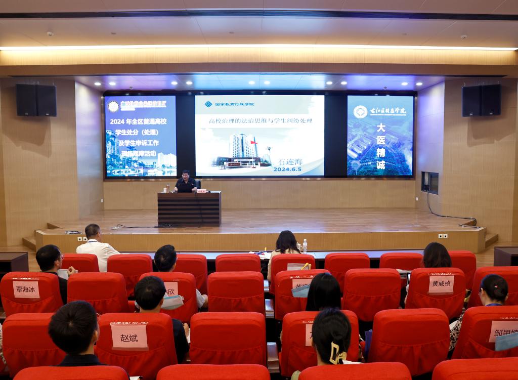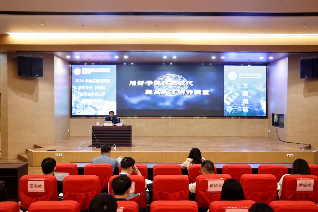 6月5日至6日,2024年全区普通高校学生处分(处理)及申诉工作现场观摩活动在beat365国际会议中心二楼学术报告厅顺利举办。本次活动由自治区教育厅主办,beat365英国官方网站承办。学校党委副书记赵丽娟、自治区教育厅高校毕业生就业创业指导中心主任韦海韬等领导出席开班仪式,来自全区各高校负责学生工作的相关校领导、负责人,beat365两办、学生工作部(处)、教务处负责人,各二级学院分管学生工作负责人及全体辅导员等参加了本次现场观摩活动。自治区教育厅高校毕业生就业创业指导中心黄瑞捷主持开班仪式。