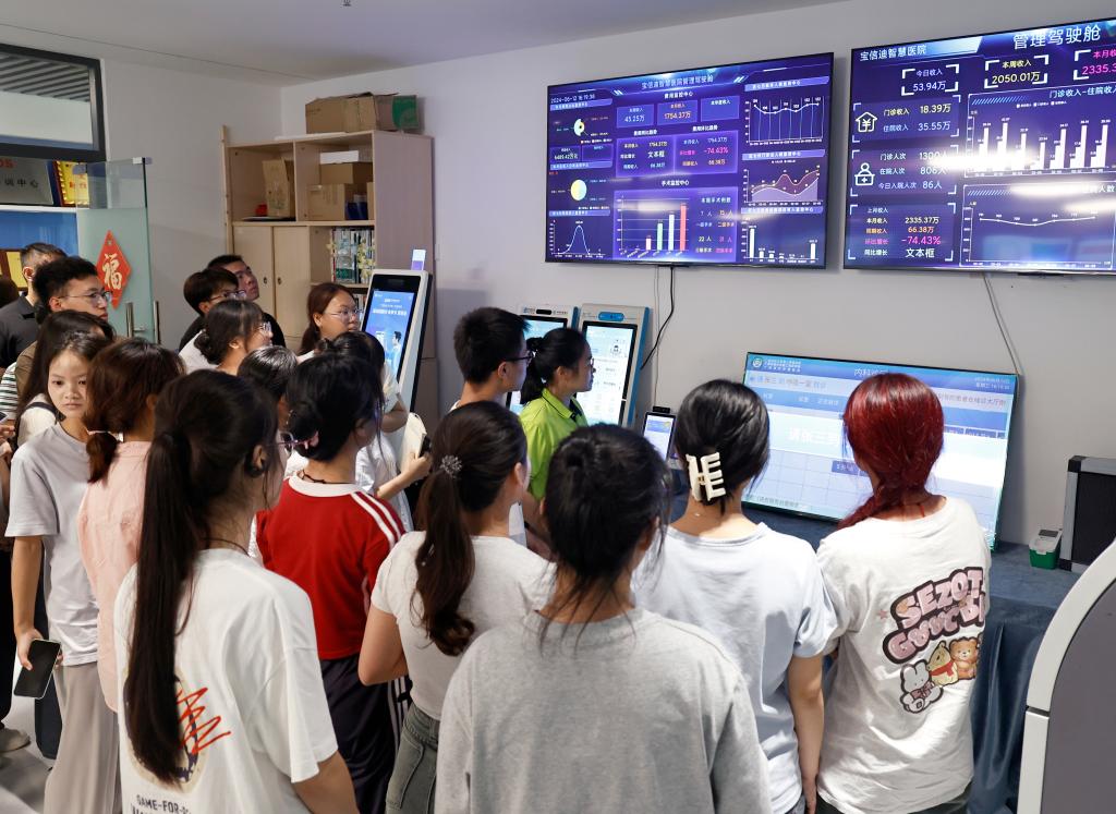 学生代表在了解公司医疗健康数字化在智慧教育、智慧医疗等领域的应用及其发挥的重要作用。