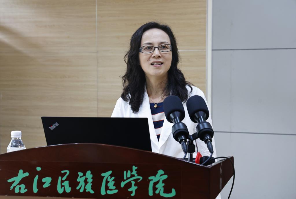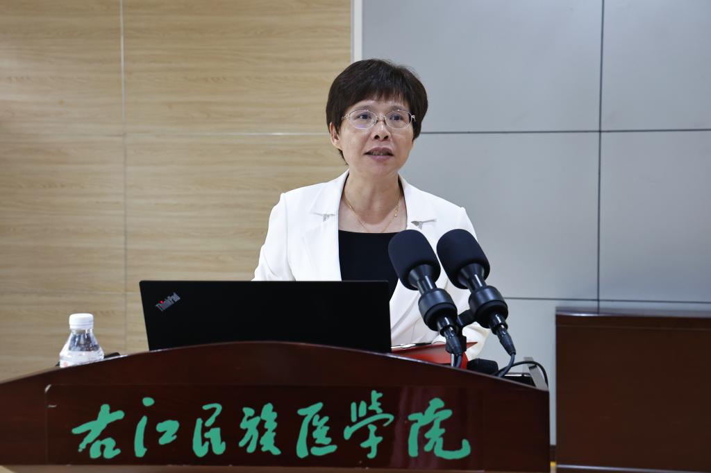 邓砚以《志存高远 脚踏实地 行循自然 共赴美好》为题,从百年党史、新中国发展历程两个方面介绍了中国青年以及右医的昨天、今天、明天,并从共圆伟大复兴中国梦方面为右医毕业生的未来指明了航向。她系统梳理了建党以来我国青年的先进事迹和历史贡献,用百年党史中的青年奋斗图谱激励引导右医青年与民族同命运、与祖国共奋进、与时代齐发展。通过重温党的十八大以来习近平总书记关于青年工作的重要讲话精神和殷殷嘱托,教育引导右医青年坚定不移听党话、跟党走,矢志砥砺奋斗,担当民族复兴大任,争做新时代好青年。回顾了右医扎根少数民族地区办学不动摇、面向基层服务不动摇、培养“下得去、用得上、留得住 ”的高质量应用型医学人才不动摇的发展史,以一代代右医人的初心使命激励毕业生志存高远,与时代、社会、学校发展同频共振。
