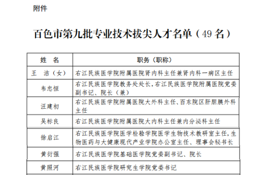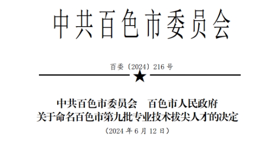 为树立典型,弘扬先进,进一步营造“尊重劳动、尊重知识、尊重人才、尊重创造”的社会氛围,激励更多的优秀专业技术人才脱颖而出,近日,中共百色市委员会办公室印发了《中共百色市委员会 百色市人民政府 关于命名百色市第九批专业技术拔尖人才的决定》(百委〔2024〕216 号),共命名49位同志为“百色市第九批专业技术拔尖人才”,beat365王洁、韦忠恒、汪建初、吴标良、徐启江、黄衍强、黄照河七位教授获此殊荣。