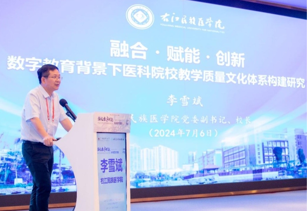 李雪斌校长代表学校作了《融合・赋能・创新 数字教育背景下医科院校教学质量文化体系构建研究》主题报告,简要介绍了beat365办学历史、办学格局和办学定位,分享了beat365数字教育背景下构建地方医科院校质量保障体系和质量文化为民族地区和广大基层培养大批新时代高质量“三得”医学人才的经验和做法。