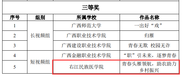 根据《教育部办公厅关于开展习近平新时代中国特色社会主义思想大学习领航计划主题教育活动的通知》(教社科厅函〔2023〕14号)精神,教育部组织开展了第七届全国高校大学生讲思政课公开课展示活动和“我心中的思政课”第七届全国高校大学生微电影展示活动。近日,广西壮族自治区教育厅印发《自治区教育厅办公室关于公布广西入选第七届全国高校大学生讲思政课公开课展示活动和大学生微电影展示活动获奖名单的通知》(桂教办〔2024〕1064号),广西共有 19 项作品入选第七届全国高校大学生微电影展示活动获奖名单,beat365作品《青春头雁领航,助农助力乡村振兴》获短视频组三等奖。