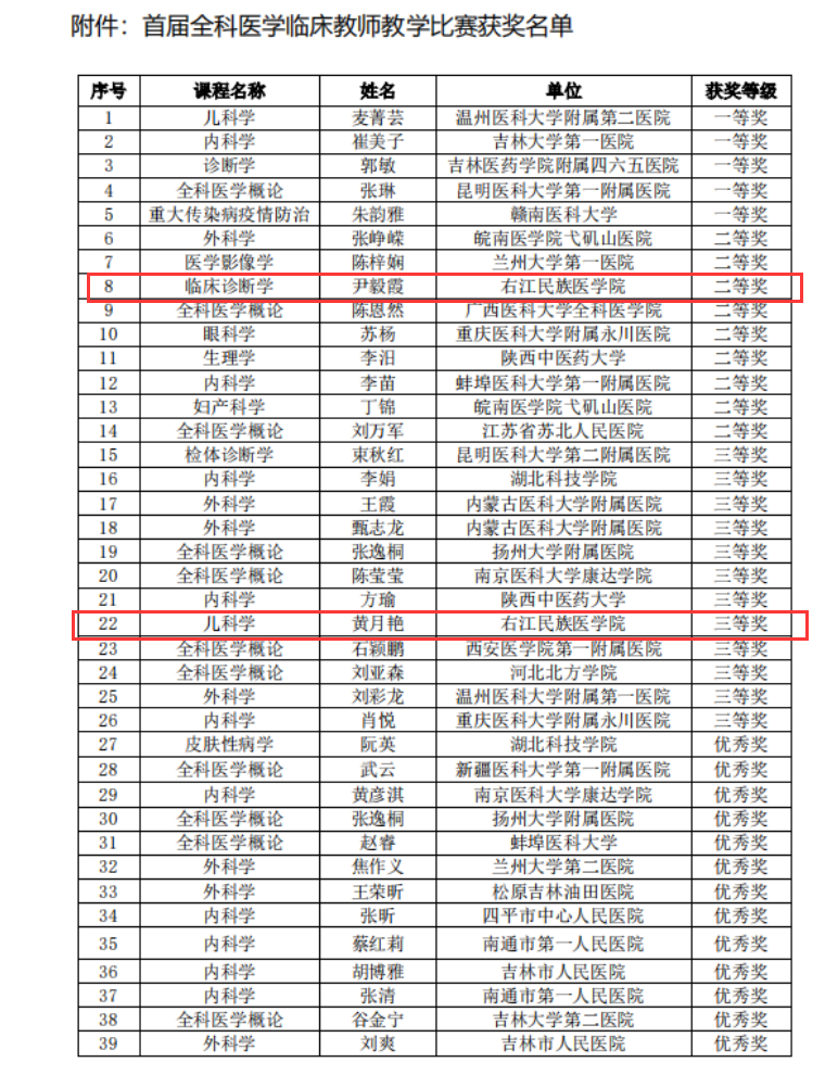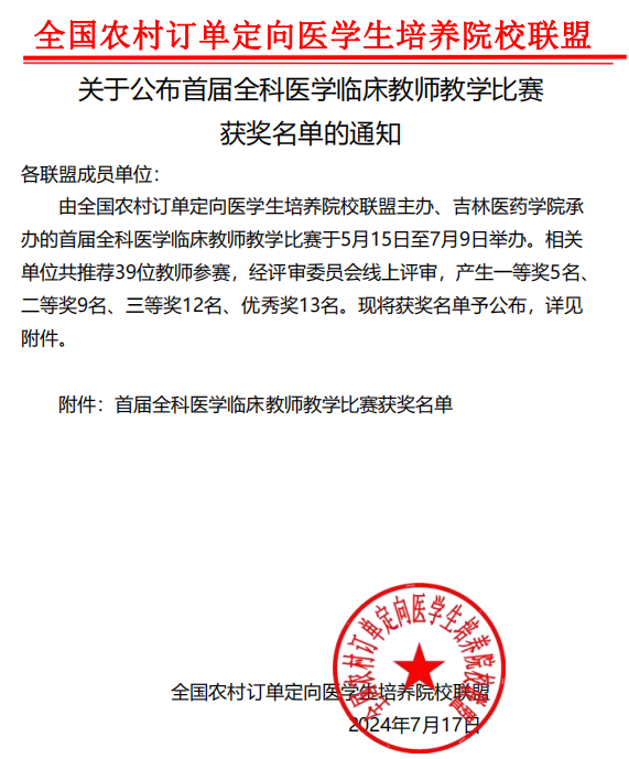 近日,全国农村订单定向医学生培养院校联盟公布首届全科医学临床教师教学比赛获奖名单。beat365尹毅霞教授荣获二等奖、黄月艳教授荣获三等奖。