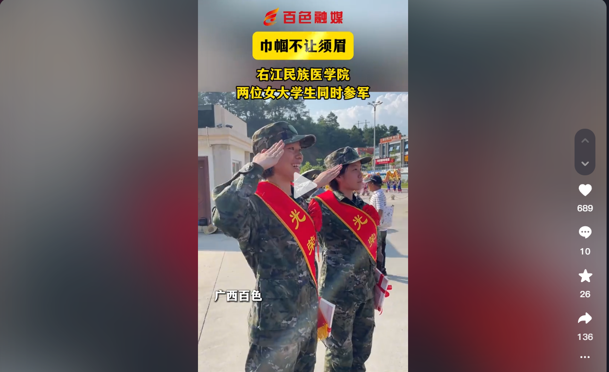 【媒体看右医】百色融媒:巾帼不让须眉,beat365英国官方网站两位女大学生同时参军。