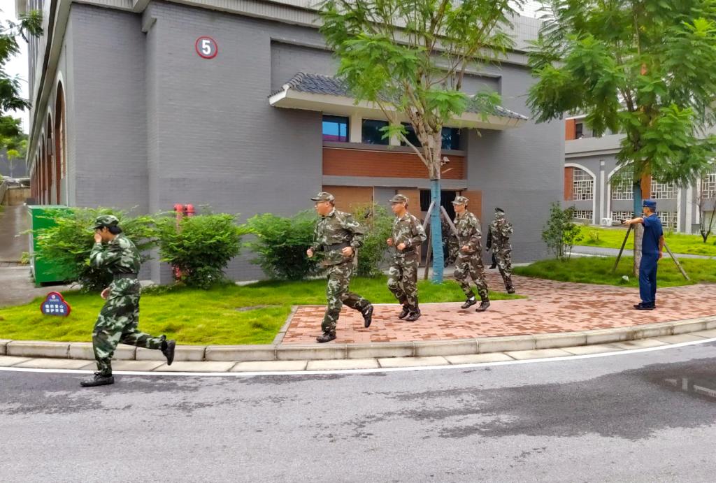 随着急促的警报声响起,消防演习正式拉开序幕。各班学生在教官的指挥下,用湿毛巾捂住口鼻,弯腰低身,按照预定的逃生路线迅速有序地从宿舍楼撤离到操场指定的安全区域。各班负责人迅速清点人数并报告总指挥,确保每位同学安全撤离。