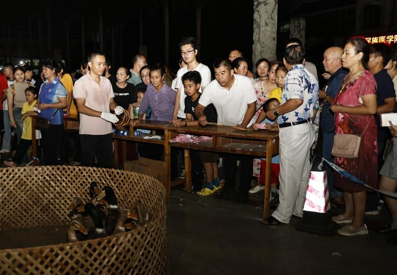 在游戏环节中,三人运球追逐赛,参赛人员势如破竹,小朋友也不甘示弱。踢毽子游戏,大家灵活的身姿在灯光下轻盈地舞动,踢毽子的身影如同优美的旋律,随着毽子的飞起和落下,节奏在空气中流转。掌上明珠游戏,将乒乓球送到终点且不落地,锻炼了大家的身体协调性,大家得到了身体上的放松和心情上的愉悦。蒙眼敲锣游戏,参与者深吸一口气,双手缓缓抬起,开启了他的摸索之旅。他挥动鼓锤向下敲去,锣鼓声如洪钟般回荡在广场上,荡漾出一种震撼人心的力量。最有趣的是套活鸭游戏,“套手”们全神贯注,适时地调整投掷力度和角度,找准机会一击必中!观众的目光紧紧跟随,每当套中鸭子时,空气中瞬间充满了无数双手击打的声音,那是观众们的激动与喜悦。