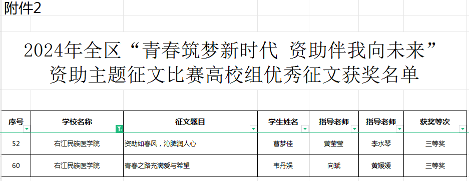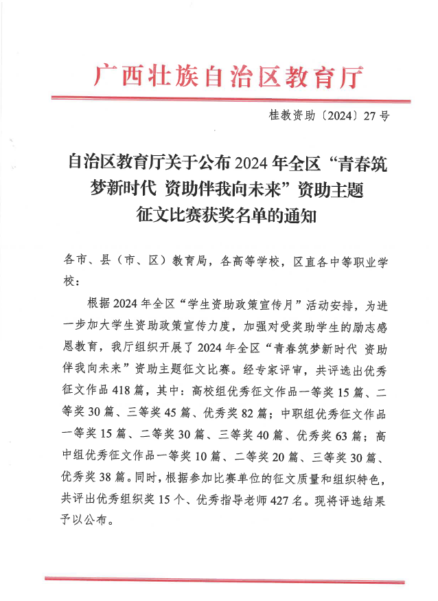 近日,2024年全区“青春筑梦新时代 资助伴我向未来”资助主题征文比赛获奖名单公布,beat365选送的两篇征文作品《资助如春风,沁脾润人心》(作者:临床医学院,曹梦佳)、《青春之路充满爱与希望》(作者:药学院,韦丹娱)荣获高校组三等奖,黄莹莹、李水琴、向斌、黄媛媛等四位老师被评为优秀指导老师。