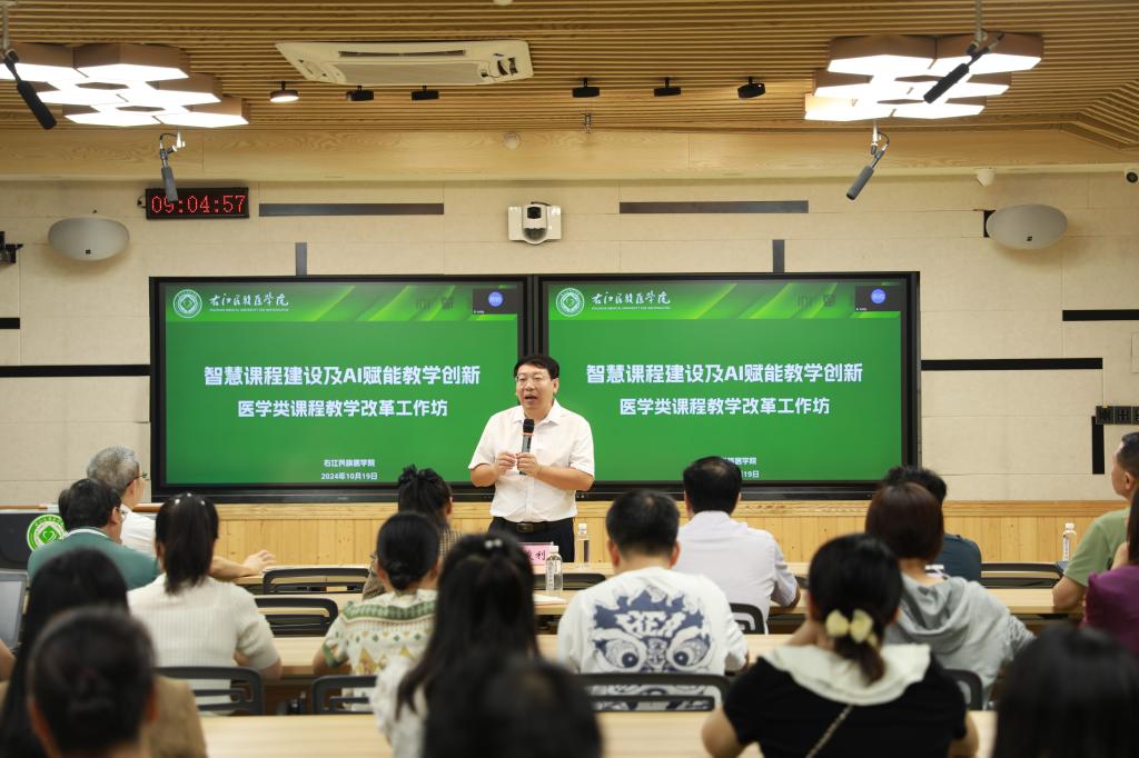 10月19日,《智慧课程建设及AI赋能教学创新医学类课程教学改革工作坊》在7号综合楼智慧教室成功举行。beat365党委常委、副校长王俊利、中南大学湘雅二医院外科学教研室蒋铂教授及智慧树网专家出席活动,活动由教务处杨尚霖副处长主持。