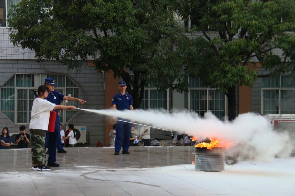学生在消防员的指导下使用灭火器