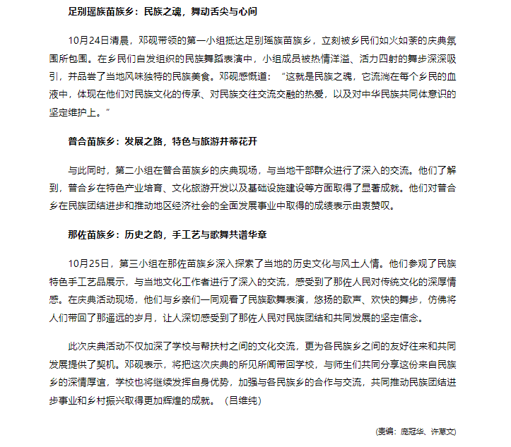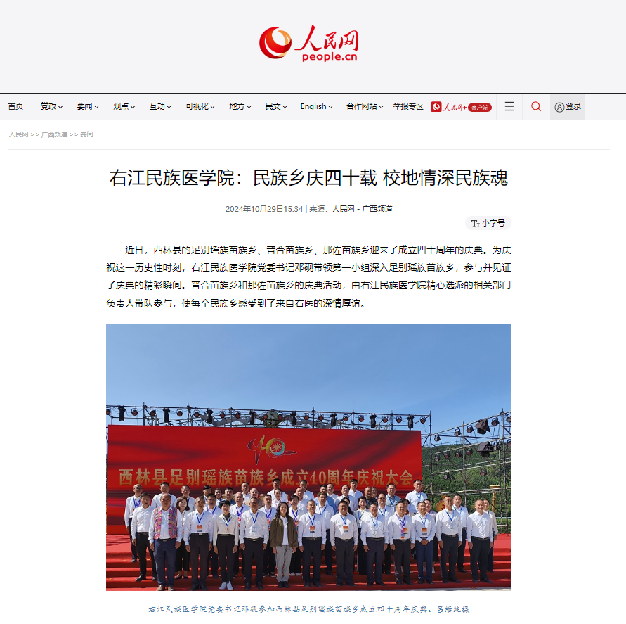 10月29日,人民网以《beat365英国官方网站:民族乡庆四十载 校地情深民族魂》为题,报道beat365党委书记邓砚带领第一小组深入足别瑶族苗族乡,参与并见证了庆典的精彩瞬间。普合苗族乡和那佐苗族乡的庆典活动,由beat365英国官方网站精心选派的相关部门负责人带队参与,使每个民族乡都感受到了来自右医的深情厚谊。