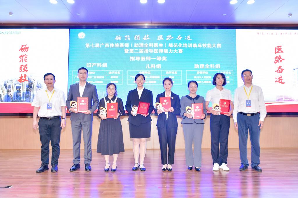 闭幕式上,自治区卫生健康委二级巡视员黄文新对获奖团队和选手表示热烈祝贺,他对选手们在竞赛中展现出来的专业技能、临床思维、团队协作能力,以及指导医师们扎实的医学功底、严谨的治学态度、卓越的教学能力给予肯定。他强调,本次大赛是一次高质量的大赛,在总结历年赛事的成果基础上,突出传承创新参赛规模、选手能力及宣传影响力等方面,较以往6届均有所突破,参赛规模为历届之最。此次大赛的成功举办,进一步提高了住院医师的临床技能和专业素养,提升了指导医师立德树人和教书育人的能力,推动我区住院医师规范化培训工作再上新台阶、实现新发展。全区各教学基地应当将大赛成果转化为日常教学和临床实践,全面提升医学生的综合素质和人才培养质量,促进全区住培工作提质增效,助力“健康广西”建设和卫生健康事业高质量发展。