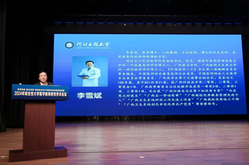 论坛以“新质赋能,融合创新,推进综合性大学医学教育高质量发展”为主题,聚焦学术前沿,瞄准关键领域,推动医学教育理念和教育实践深度交流,共同推进综合性大学医学教育高质量发展。教育部公共卫生与预防医学专业教学指导委员会委员、综合性大学医学教育研究学术论坛组委会主席邱洪斌,中国高等教育学会医学教育专业委员会副理事长、北京大学医学教育研究所顾问郭立,河北工程大学党委书记于树江,党委副书记、校长倪志宇等专家领导出席。来自全国52所综合性大学和医学院校的专家学者200余人参加活动。beat365谭盛葵副校长带领教务处相关负责人参加会议。