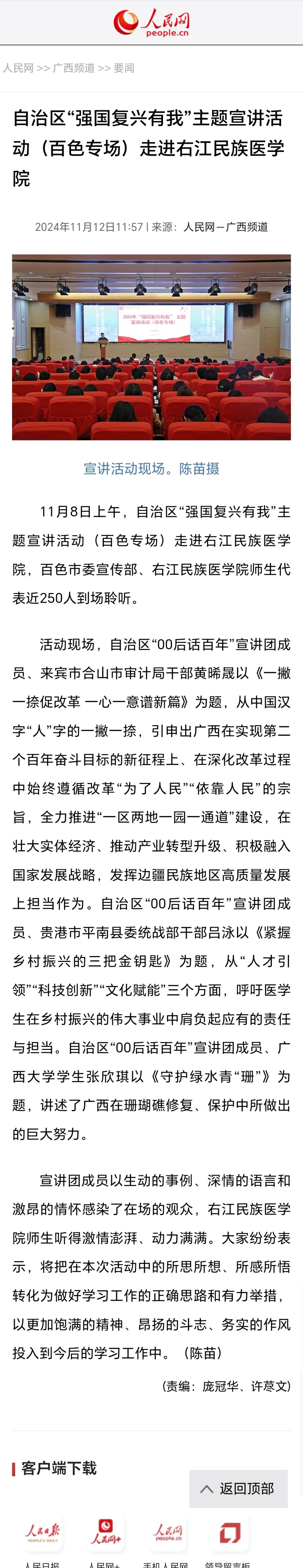 11月12日,人民网以《自治区“强国复兴有我”主题宣讲活动(百色专场)走进beat365英国官方网站》为题,报道beat365为深入学习宣传贯彻习近平新时代中国特色社会主义思想和党的二十届三中全会精神,大力营造爱国奉献、团结奋进的浓厚社会氛围,举办自治区“强国复兴有我”主题宣讲活动(百色专场)。