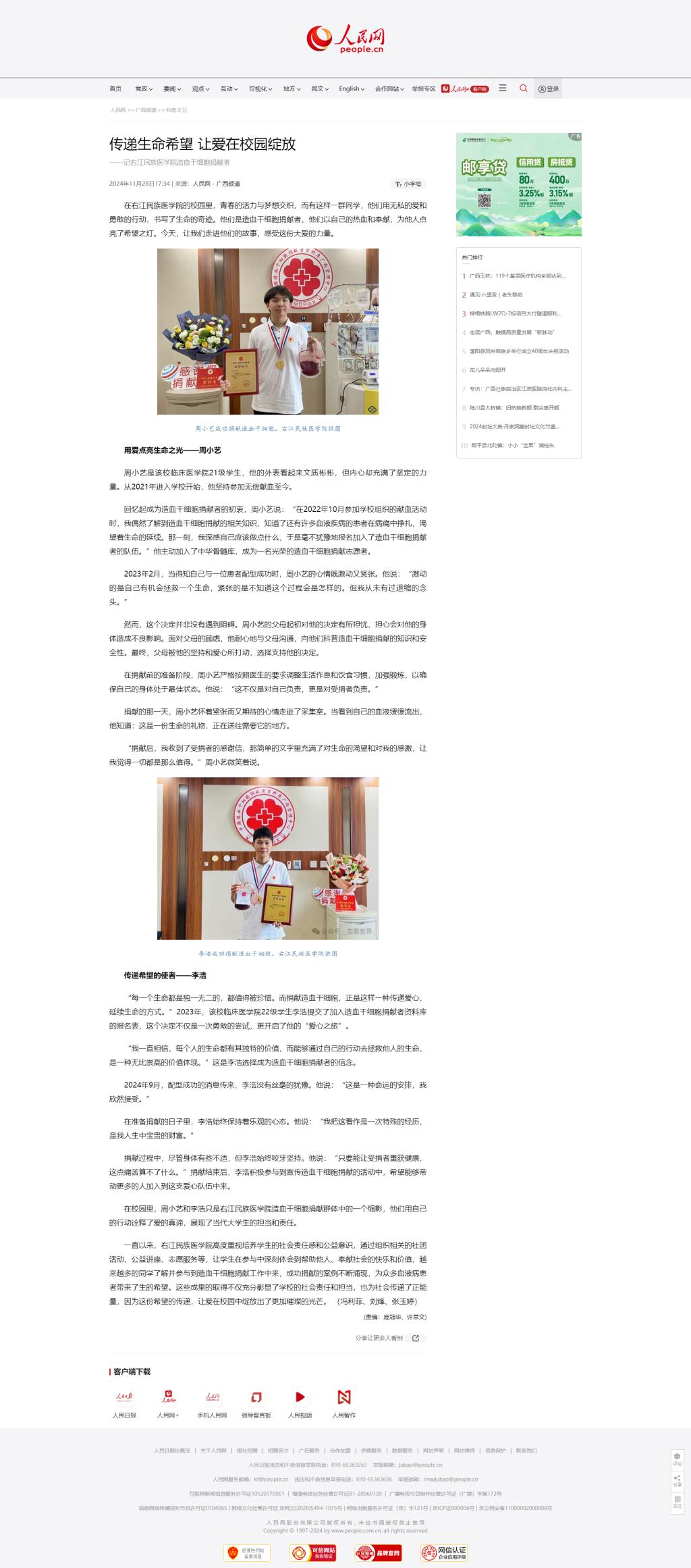 11月28日,人民网以《传递生命希望 让爱在校园绽放——记beat365英国官方网站造血干细胞捐献者》为题,报道beat365造血干细胞捐献者周小艺和李浩的感人事迹。