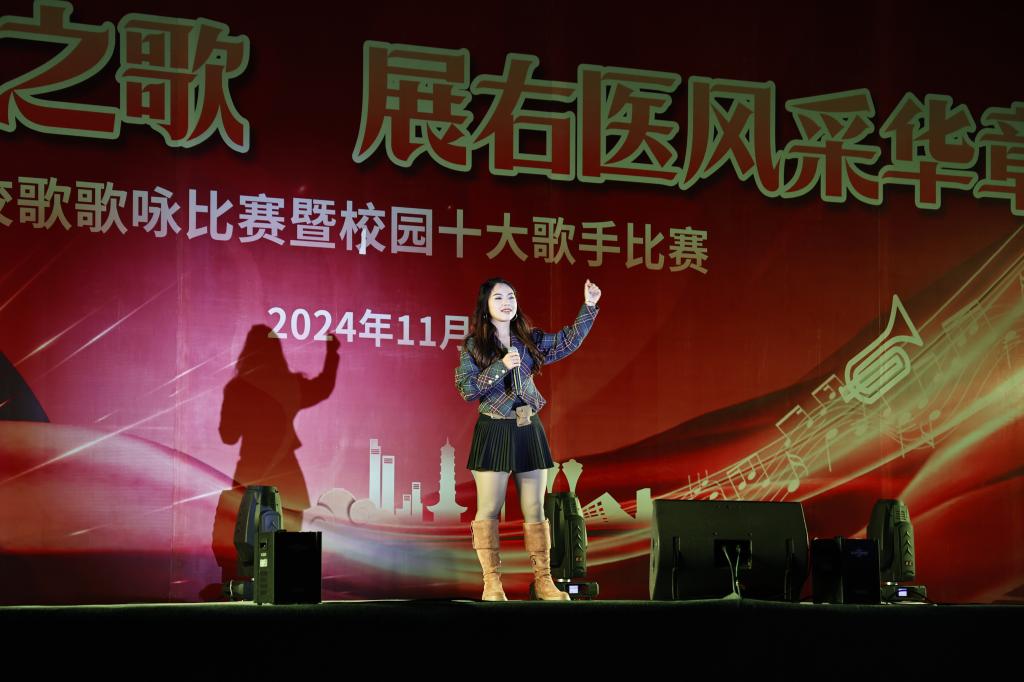 11月29日晚,beat365举行第三十二届“青春无畏,医路‘声’花”校园十大歌手比赛总决赛。图为十大歌手冠军韦珊珊演唱《爱与痛的边缘》。