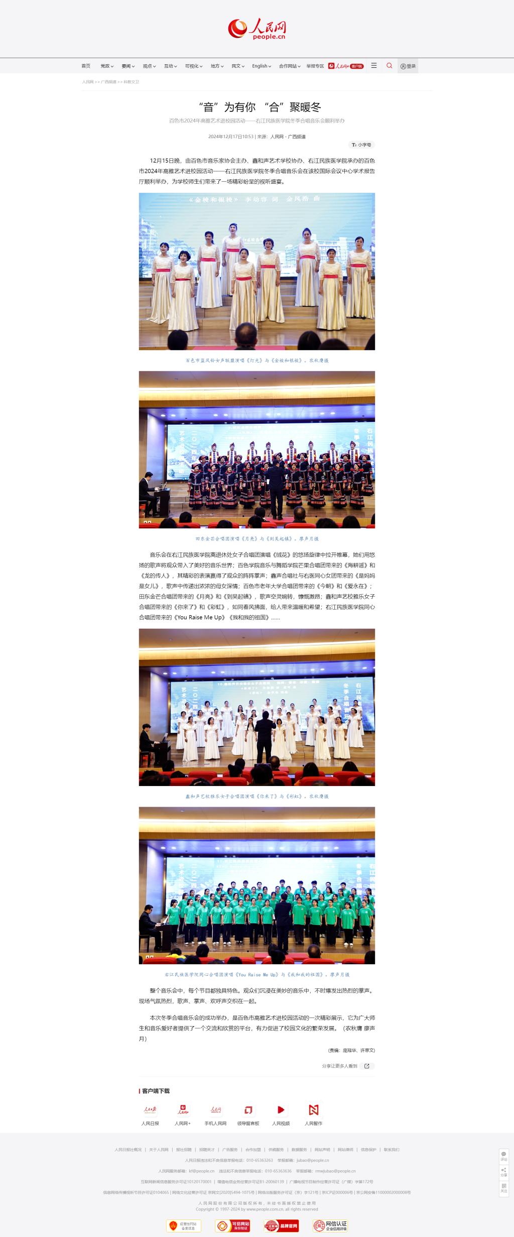 12月17日,人民网以《“音”为有你 “合”聚暖冬 百色市2024年高雅艺术进校园活动——beat365英国官方网站冬季合唱音乐会顺利举办》为题,报道由百色市音乐家协会主办、鑫和声艺术学校协办、beat365英国官方网站承办的百色市2024年高雅艺术进校园活动——beat365英国官方网站冬季合唱音乐会在我校国际会议中心学术报告厅顺利举办,为学校师生们带来了一场精彩纷呈的视听盛宴。