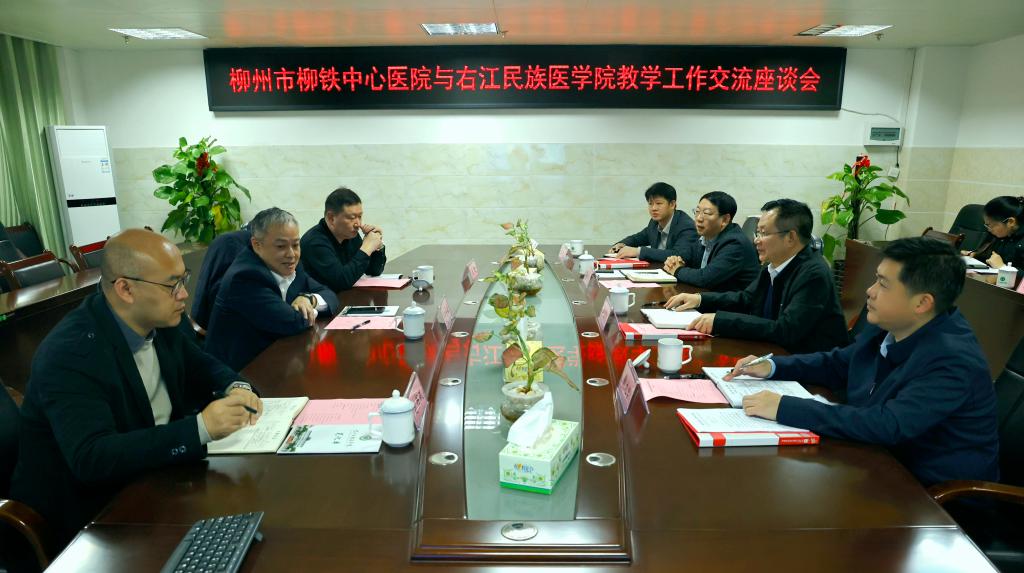1月22日,柳州市柳铁中心医院院长郑捷敏、副院长张敬、教学部部长赵书斌一行3人到beat365进行教学工作交流座谈。学校党委书记李雪斌,党委副书记、校长黄龙坚,党委常委、副校长王俊利,相关职能部门主要负责人和有关工作人员参加座谈会。会议由王俊利主持。
