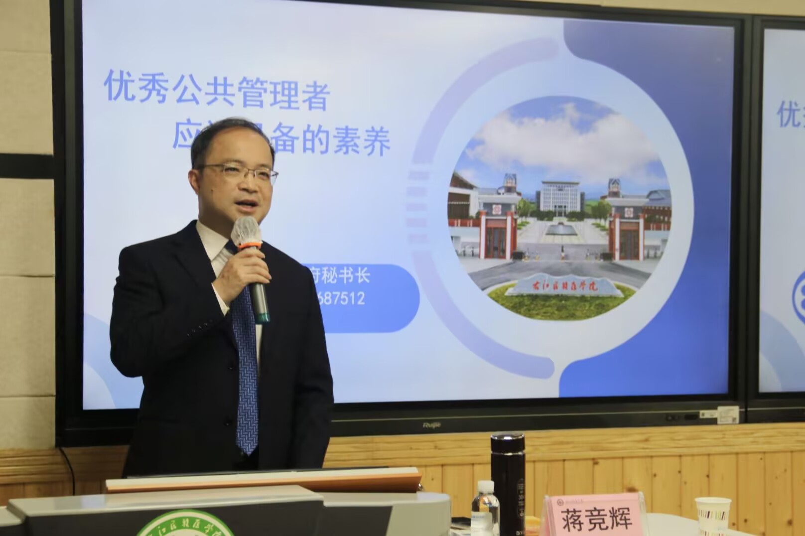 蒋竞辉围绕“优秀公共管理者应该具备的素养”这一主题,从要有较高的人文素养、要有以人为本的理念、要有以问题为导向的意识、要有开阔的视野、要有创新的思维五个方面进行了深入浅出的阐述。讲座上,蒋竞辉结合自身丰富的公共管理实践经验,强调公共管理者肩负着服务人民、造福社会的重任,必须具备高尚的道德情操和人文情怀,要丰富自我阅历,了解人文历史,才能做好管理工作。在国内外形势日益复杂的今天,他强调,要具备全球视野和战略思维,善于学习借鉴国内外先进经验,利用好最新的智能工具,如深度搜索(Deepseek),以智赋能,不断创新工作思路和方法。