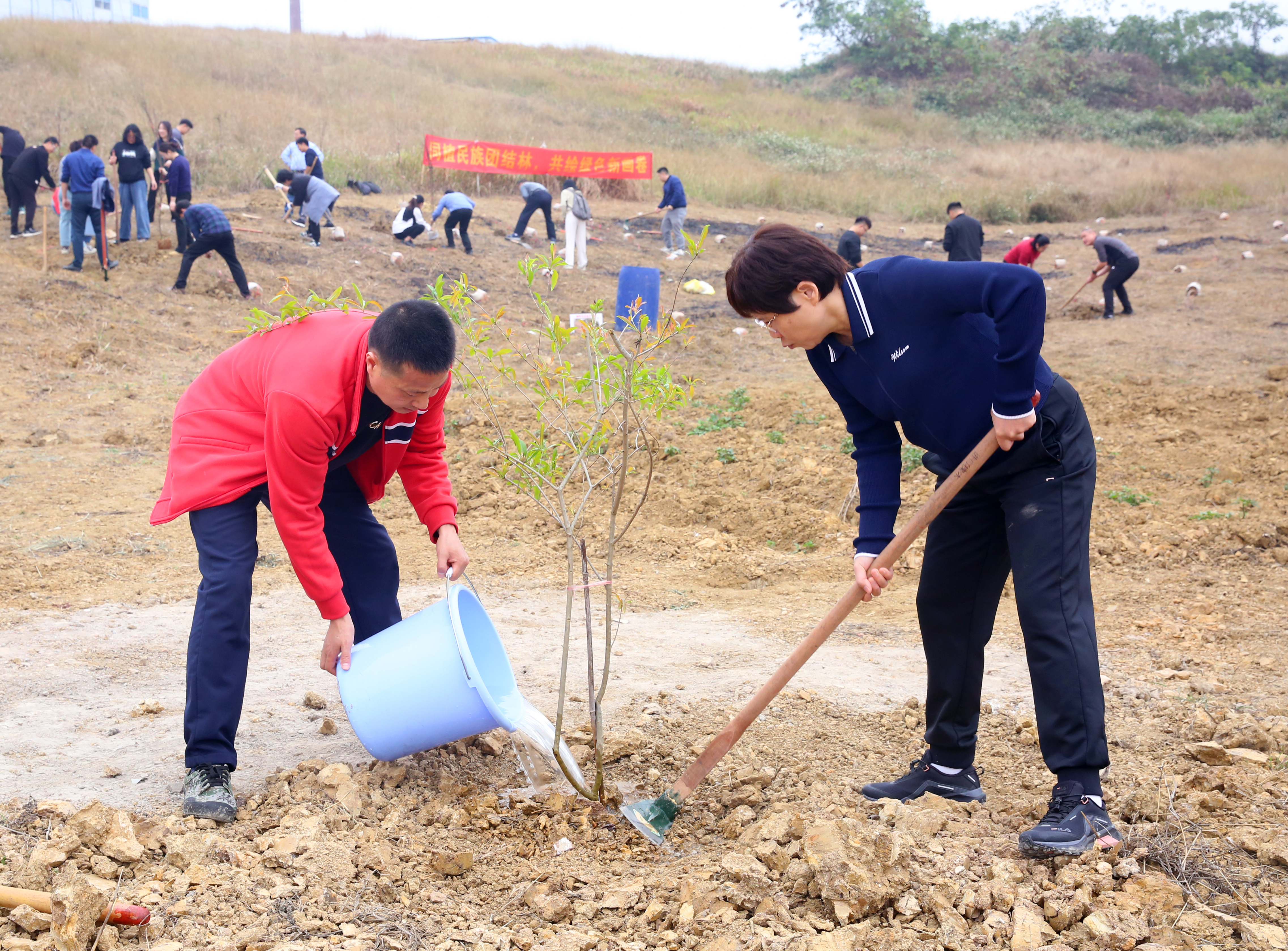 一棵树苗,一份希望;一片新绿,一份担当。在这个充满希望的季节里,师生们用汗水浇灌绿色梦想,以行动践行环保理念,不仅为校园增添了绿色,更增强了全校师生的环保意识和团队协作精神,营造了绿色、和谐、美丽的校园环境。一直以来,学校高度重视校园生态文明建设与民族团结教育工作,此次植树活动,不仅是一次践行绿色理念的实践行动,更是一堂生动的民族团结教育课,校领导通过与师生的共同参与和交流,让绿色环保意识与民族团结观念更加深入人心。